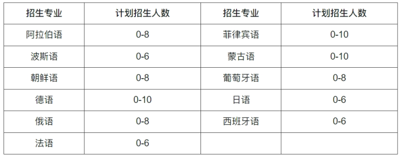 考生可填報五個專業(yè)志愿。德語、法語、西班牙語、俄語、日語、葡萄牙語專業(yè)只招收第一志愿考生,其它專業(yè)不限。