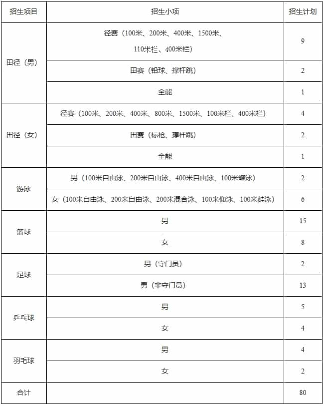 1.招生計(jì)劃≤18人。其中:足球(男)≤3人、乒乓球≤3人、籃球≤3人、排球≤3人、田徑≤3人、游泳≤3人。