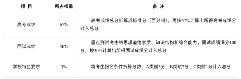 綜合加權總分=高考成績÷750×100×0.67+面試成績×0.3+學校特色要求分(即A類3分、B類2分、C類1分)