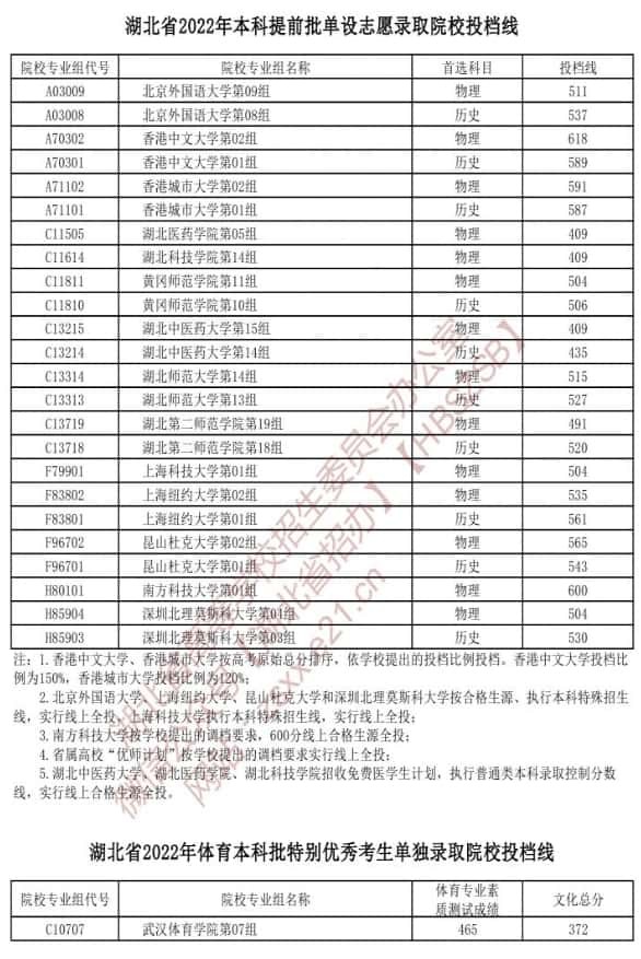 湖北省2022年本科提前批單設(shè)志愿錄取院校投檔線公布