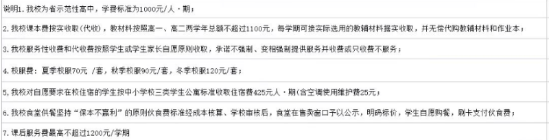 校園生活設(shè)施完善,住宿有公寓式宿舍,備有熱水系統(tǒng)與冷暖空調(diào),每位學(xué)生都備有高檔實木床鋪和實木柜子。學(xué)費(fèi)收費(fèi)標(biāo)準(zhǔn)如下所示: