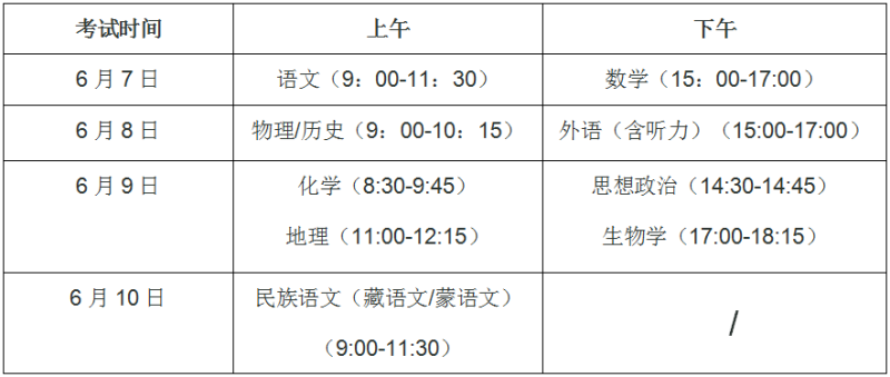 統(tǒng)一高考科目考試時(shí)間以教育部公布為準(zhǔn),如有調(diào)整,選考科目和民族語(yǔ)文科目的考試安排相應(yīng)調(diào)整。