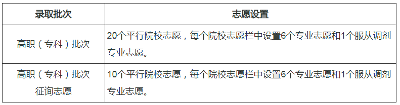 提前高職(??疲┡卧O(shè)置1個院校志愿,院校志愿中設(shè)置3個專業(yè)志愿和1個服從調(diào)劑專業(yè)志愿。